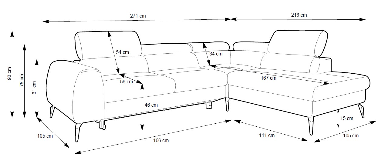 Rozměr: 271 x 216 cm, Spací plocha: 195 x 122 cm, Výška: 75 / 93 cm